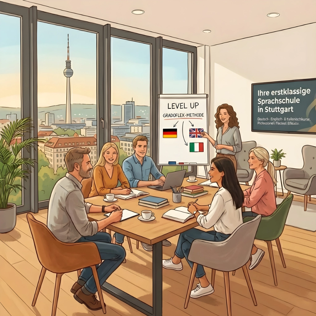 Willkommen bei LEVEL UP. Wir bieten hochwertiges Sprachtraining, das auf Ihre Bedürfnisse zugeschnitten ist. Egal, ob Sie einen Deutschkurs, professionelles Englischtraining in Stuttgart oder Italienischunterricht suchen – mit unserer einzigartigen GRADOFLEX-Methode erreichen Sie fließende Sprachkenntnisse.